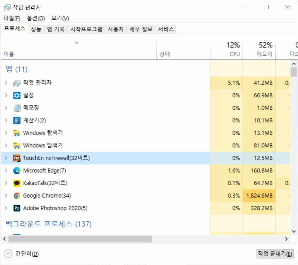 1. 첫번째로는 TouchEn nxFirewall 프로그램을 삭제하는 방법입니다. 물론 해당 프로그램이 실행되어야만 사용할 수 있는 사이트를 계속해서 이용하려면 또다시 설치를 해야 할 수 있겠지만 일단 삭제하고 나면 인터넷 멈춤이나 느림 현상 등이 사라지는 걸 확인할 수 있었는데요, 먼저 키보드의 Ctrl+Alt+Delete 버튼을 눌러 [작업 관리자]를 실행합니다.