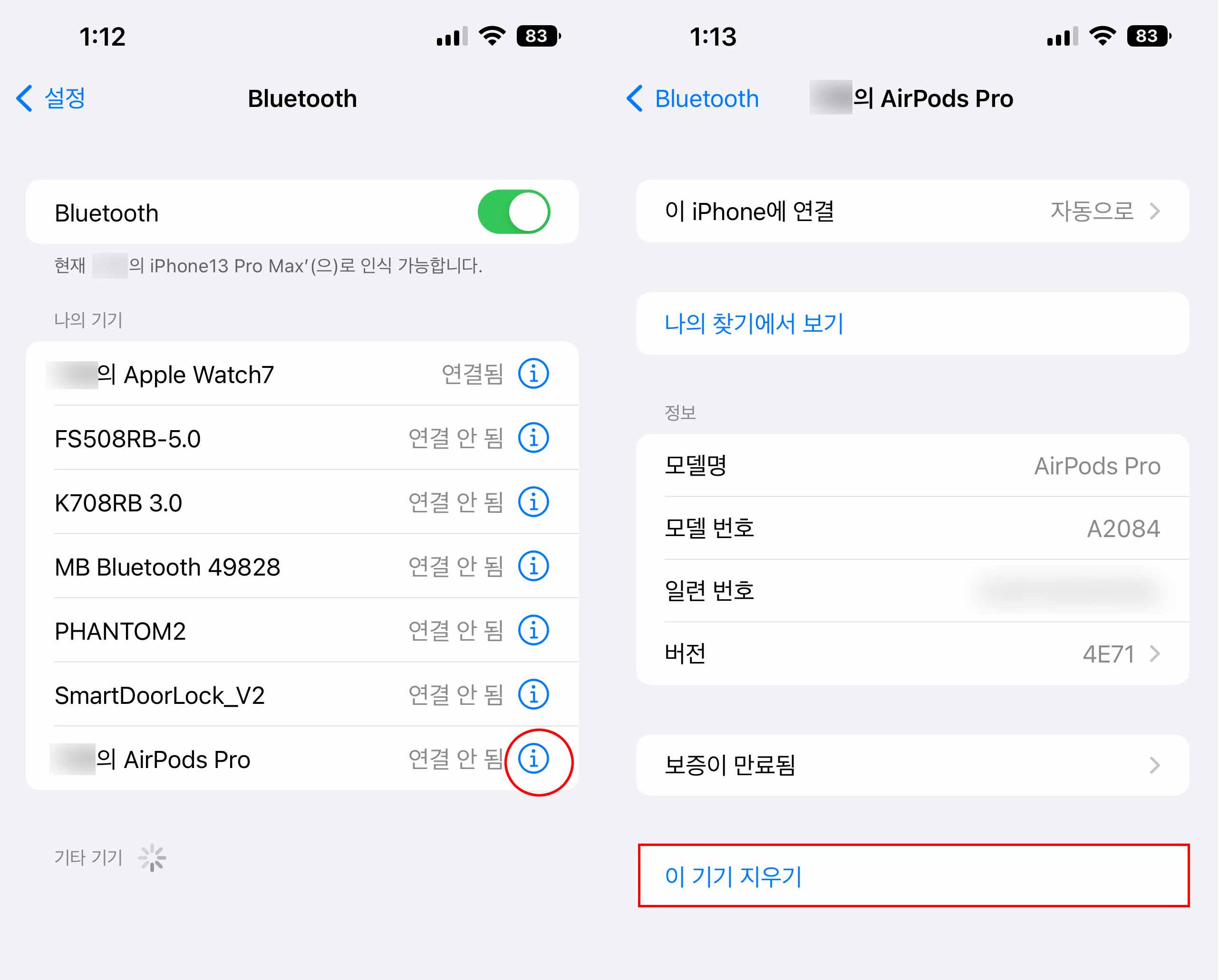 블루투스 메뉴에서 나의 에어팟 프로를 찾아 [ i ] 버튼을 눌러주신 후 에어팟프로 정보 메뉴에서 맨 아래 '이 기기 지우기' 버튼을 눌러주신 후 에어팟 프로를 삭제해주세요. 재등록은 간편하니 겁먹지 마시고 삭제해주시면 됩니다.